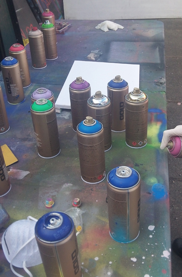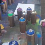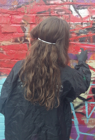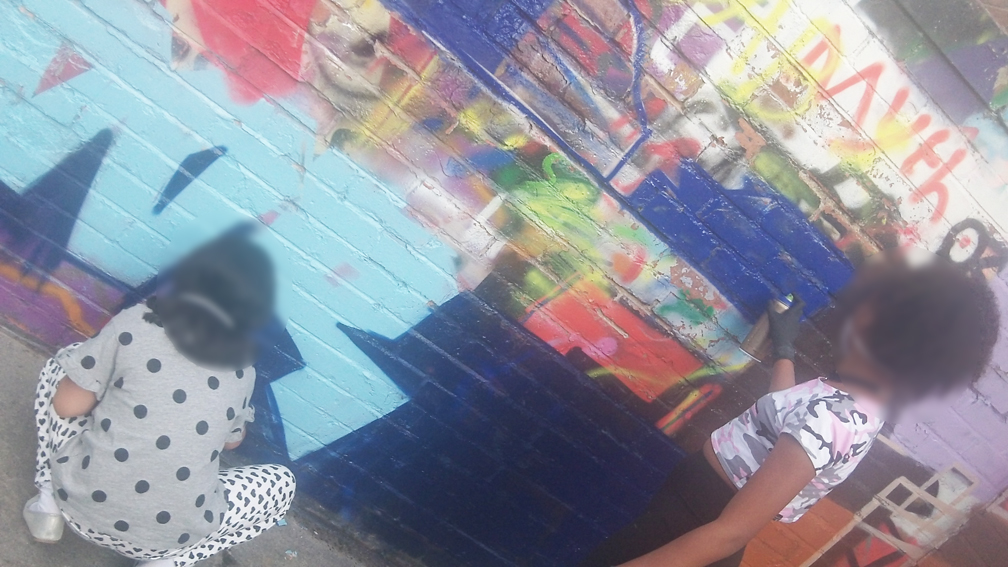 The following week the group started to paint out the previous murals and get the main colour shapes onto the wall. Over the space of four hours the wall was transformed and ready for the finishing touches. Some of the more confident members of the group helped to put the bees and other stencils onto the walls with our artist @JmeDzynz finishing off.